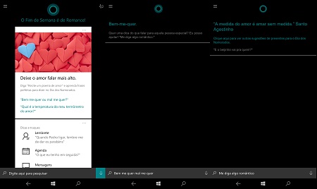Nesta Segunda-Feira (12/6) é comemorado o dia dos namorados e a Cortana (Assistente Pessoal de Voz da Microsoft) se preparou para deixar esse dia ainda mais romântico. Ela conta piadas sobre namorados, faz cantadas de pedreiro e de quebra ainda entra no clima do Bem me quer, mal me quer. Ele é mesmo muito espertinha e vai te salvar de poucas e boas. No começo do mês fizemos uma matéria sobre ela contando essa novidade e se você não ter a oportunidade ler, poder fazer isso neste link aqui. Divirta-se com a Cortana, mais vamos logo avisando; Ela não curte muito esse lance de namoro entre assistentes pessoais e humanos, se você quiser algo a mais deverá recorrer a Siri (Apple) ou a Alexia (Amazon) que também interagem com você. Com a Cortana você pode deixar o amor falar mais alto e se entregar de corpo e alma nessa sua paixão. Ela funciona muito bem em português no seu habitat natural (Windows 10 [Desktop, Notebook e Tablete], Windows 10 Mobile [Smartphones] e Xbox One [Vídeo-game].