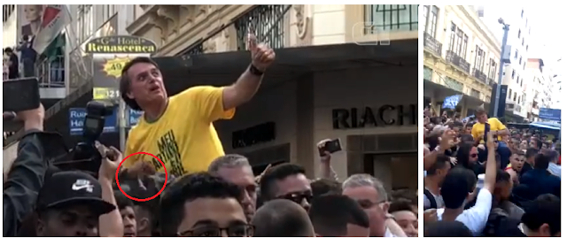 O fato ganhou as Redes Sociais e logo o nome Jair Bolsonaro foi um dos mais pesquisados no Facebook e Google. Aqui em Limoeiro muitas pessoas comentaram estarrecidas sobre o fato e trataram isso como inaceitável, afinal vivemos em uma democracia e devemos respeitar a todos mesmo não concordando com suas ideias, disse Dona Neuza a nossa reportagem quando questionada sobre o fato. No comercio e nas rodas de conversas um dos assuntos mais falado foi justamente esse que envolveu Jair Bolsonaro. No WhatsApp o vídeo do momento em que Bolsonaro foi esfaqueado logo circulou e foi compartilhado em inúmeros grupos e politica e afins. O meliante foi identificado pela PM como Adélio Bispo de Oliveira e foi levado para ser interrogado pela policia, mas antes disso ele foi agredido por populares não aceitaram o que ele fez com o presidenciável. Na foto acima você vê circulado de vermelho o momento que a faca entra em Bolsonaro e o atinge.